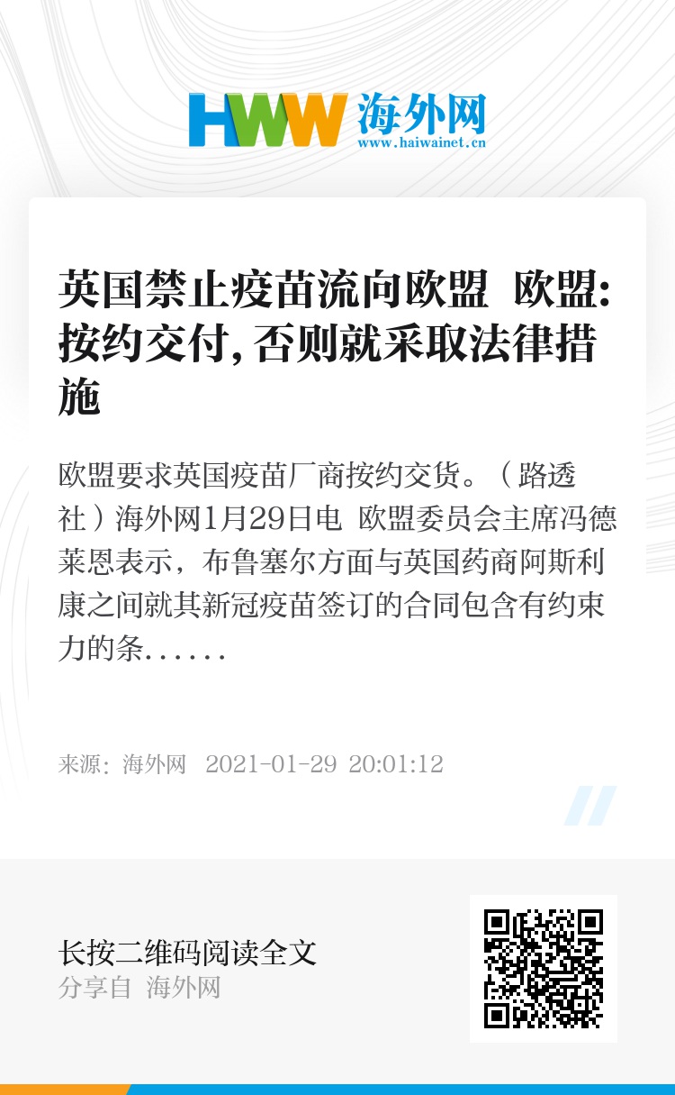 海外网1月29日电 欧盟委员会主席冯德莱恩表示,布鲁塞尔方面与英国药商阿斯利康之间就其新冠疫苗签订的合同包含有约束力的条款。药商需要按照合同约定供给疫苗,否则双方谈判失败,欧盟将提出采取法律行动。