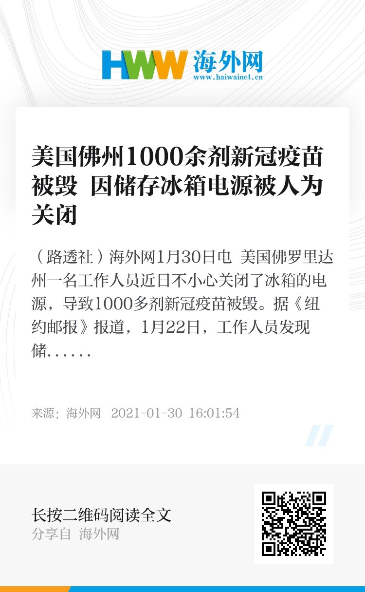 海外网1月30日电 美国佛罗里达州一名工作人员近日不小心关闭了冰箱的电源,导致1000多剂新冠疫苗被毁。