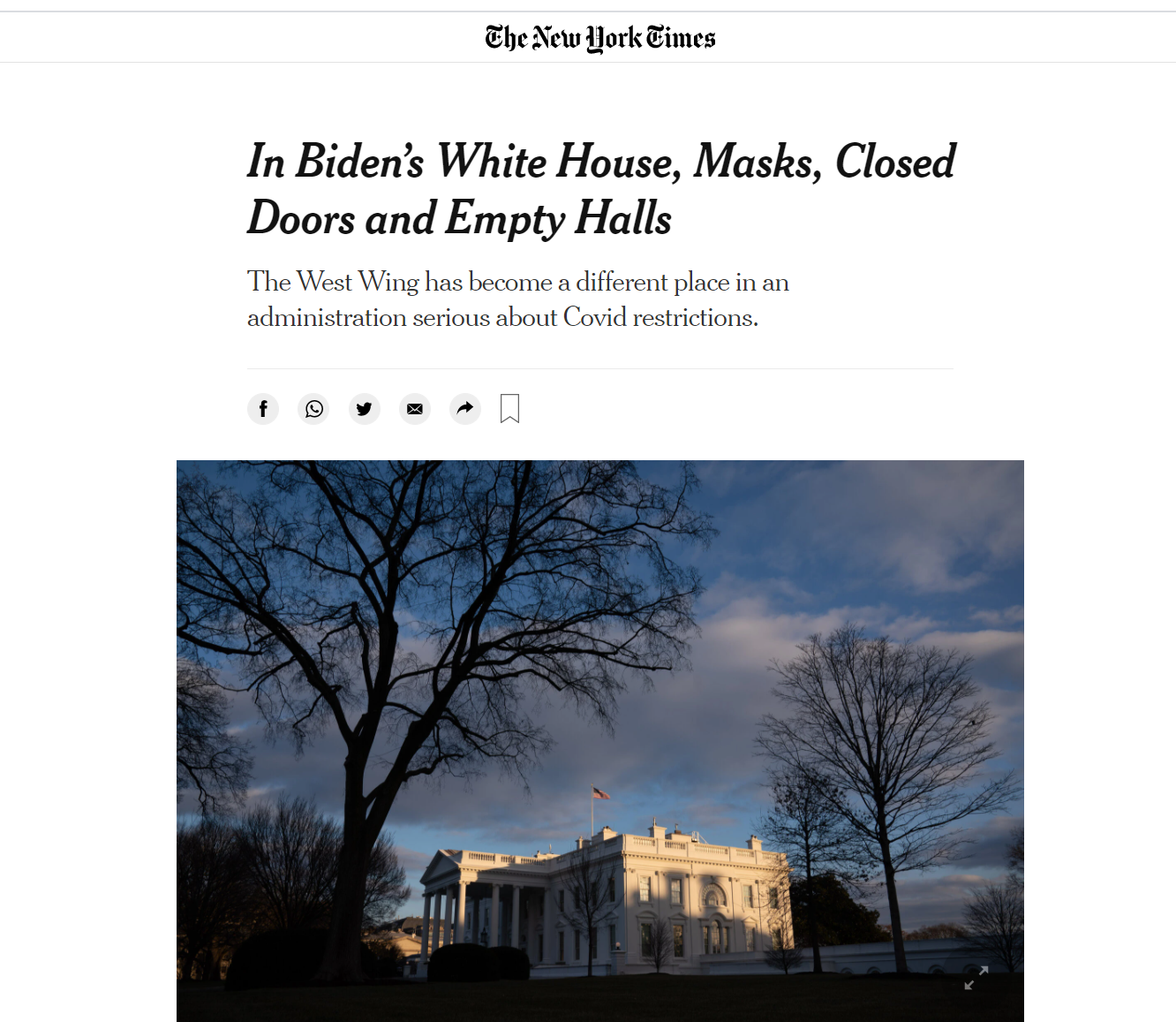 《纽约时报》:在拜登的白宫,口罩、紧闭的门和空荡荡的大厅