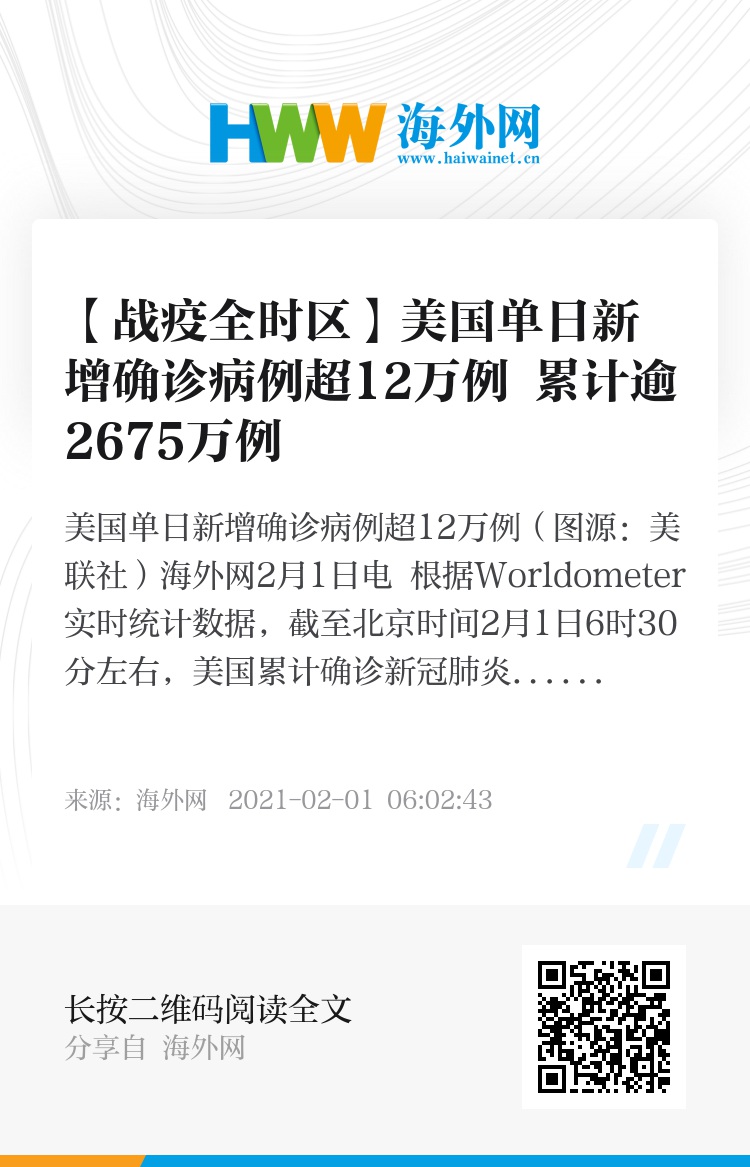 海外网2月1日电 根据Worldometer实时统计数据,截至北京时间2月1日6时30分左右,美国累计确诊新冠肺炎病例26751925例,累计死亡病例451758例。与前一日6时30分数据相比,美国新增确诊病例120614例,新增死亡病例1848例。(海外网 姚凯红)