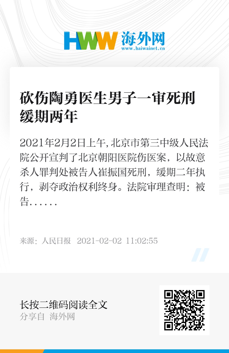 2021年2月2日上午,北京市第三中级人民法院公开宣判了北京朝阳医院伤医案,以故意杀人罪判处被告人崔振国死刑,缓期二年执行,剥夺政治权利终身。