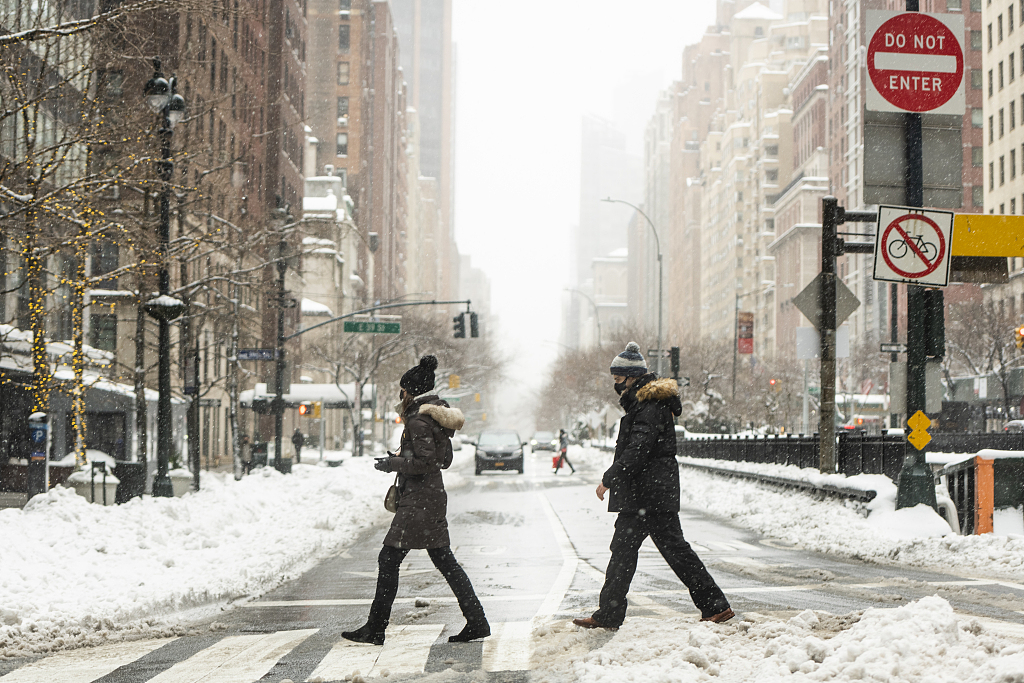 当地时间2021年2月2日,美国纽约,暴风雪过后,民众艰难出行。图片来源:视觉中国