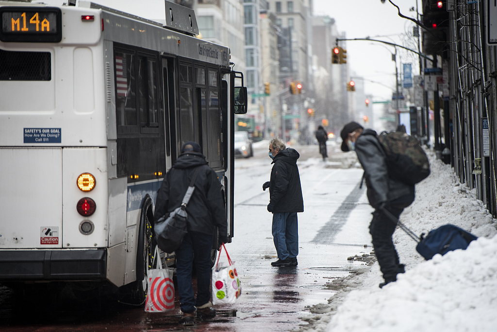 当地时间2021年2月2日,美国纽约,暴风雪过后,民众艰难出行。图片来源:视觉中国