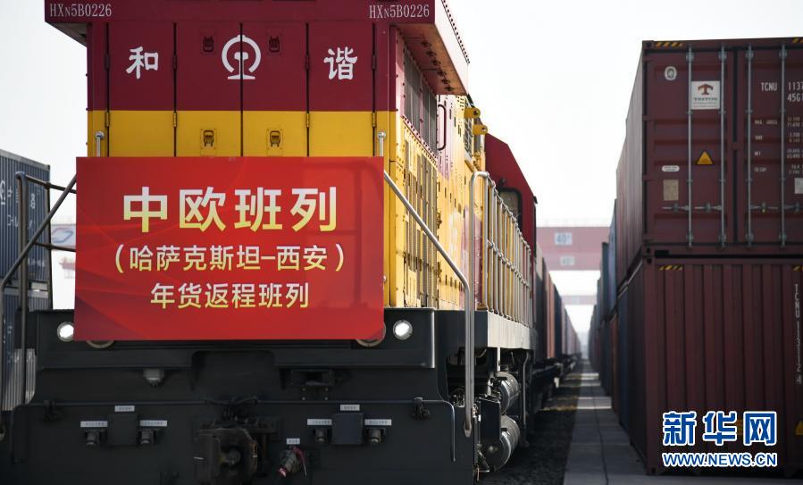 2月3日,满载年货的中欧班列抵达中国铁路西安局集团有限公司新筑车站。当日,满载着49车“洋年货”的X9020次中欧班列抵达中国铁路西安局集团有限公司新筑车站,这是2021年从哈萨克斯坦开出后抵达西安的首趟中欧班列(西安)年货返程班列。这趟班列装载有面粉、食用油、蜂蜜、糖果等丰富的年货产品。新华社记者 李一博 摄