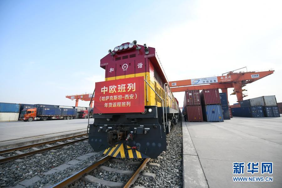 2月3日,满载年货的中欧班列抵达中国铁路西安局集团有限公司新筑车站。当日,满载着49车“洋年货”的X9020次中欧班列抵达中国铁路西安局集团有限公司新筑车站,这是2021年从哈萨克斯坦开出后抵达西安的首趟中欧班列(西安)年货返程班列。这趟班列装载有面粉、食用油、蜂蜜、糖果等丰富的年货产品。新华社记者 李一博 摄