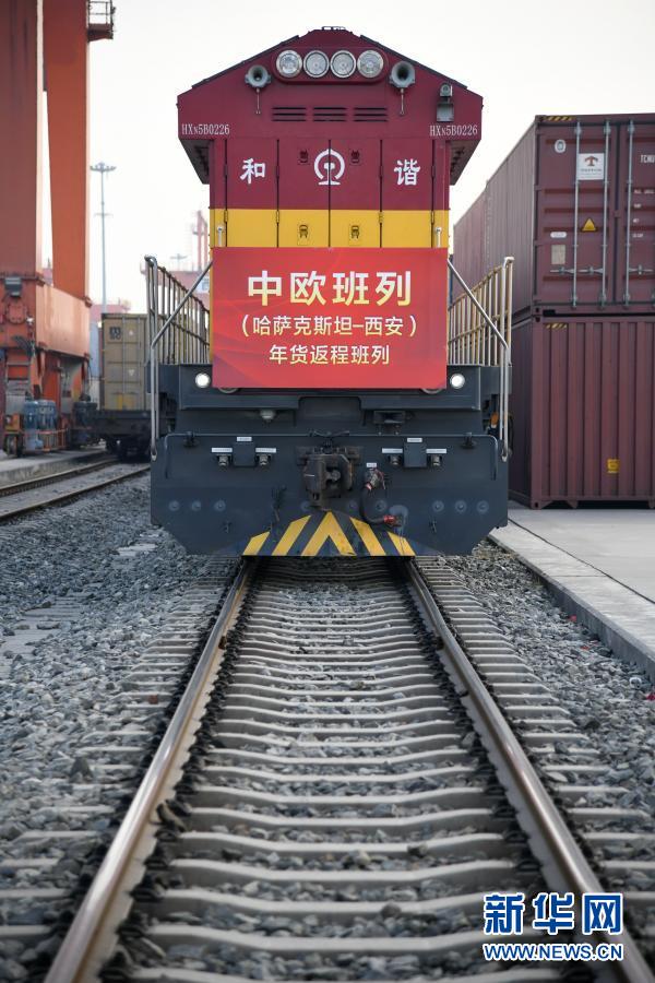 2月3日,满载年货的中欧班列抵达中国铁路西安局集团有限公司新筑车站。当日,满载着49车“洋年货”的X9020次中欧班列抵达中国铁路西安局集团有限公司新筑车站,这是2021年从哈萨克斯坦开出后抵达西安的首趟中欧班列(西安)年货返程班列。这趟班列装载有面粉、食用油、蜂蜜、糖果等丰富的年货产品。新华社记者 李一博 摄