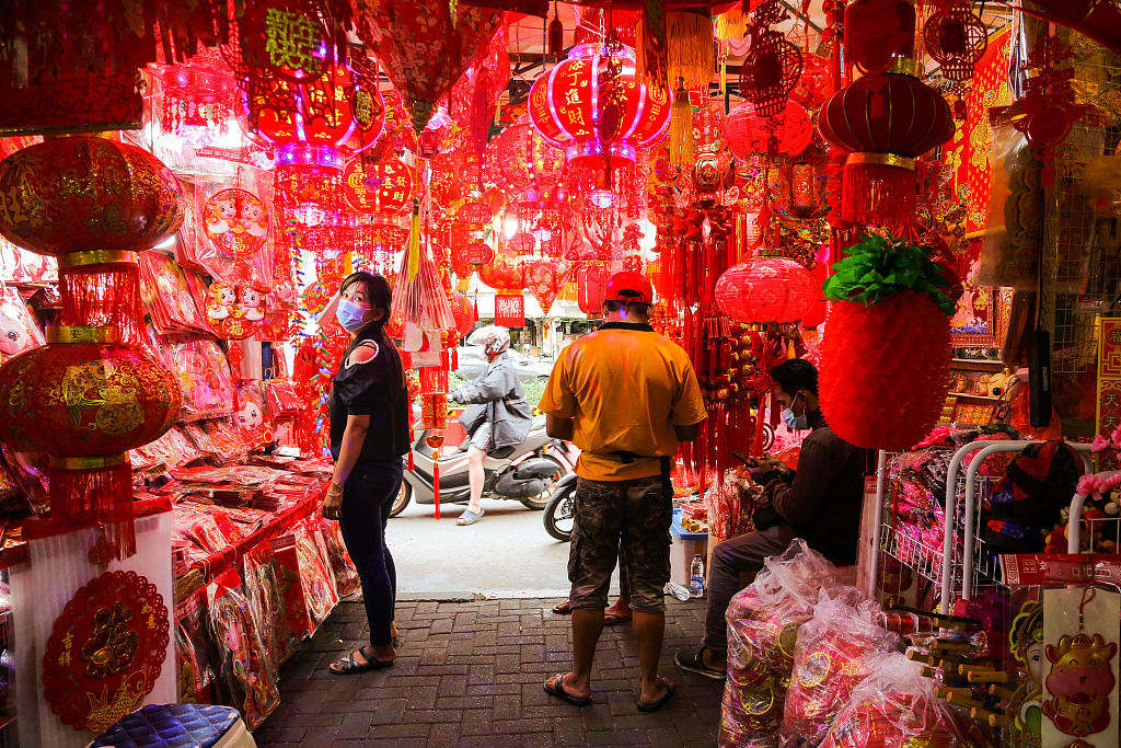 ​当地时间2021年2月3日,印度尼西亚雅加达,雅加达唐人街街头小贩售卖春节用品。图片来源:视觉中国