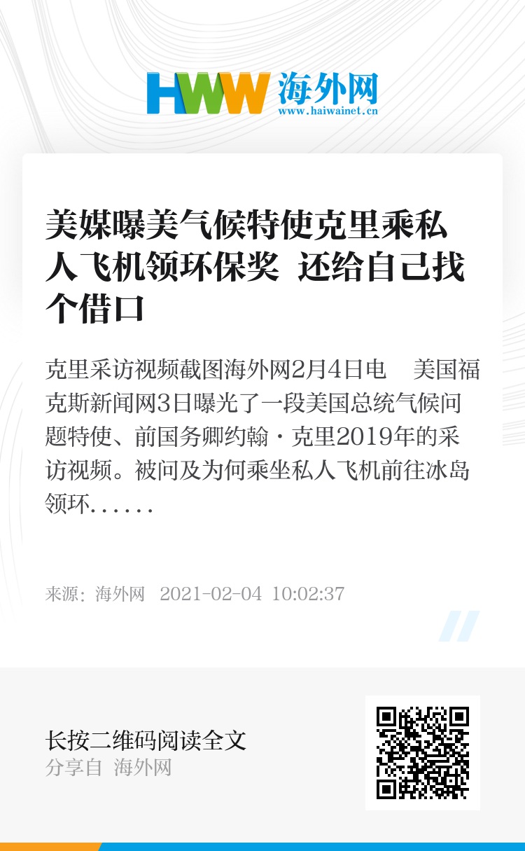 海外网2月4日电 美国福克斯新闻网3日曝光了一段美国总统气候问题特使、前国务卿约翰·克里2019年的采访视频。被问及为何乘坐私人飞机前往冰岛领环保奖,克里为自己辩护,并暗示没有其他选择。共和党议员讽刺这很“虚伪”。