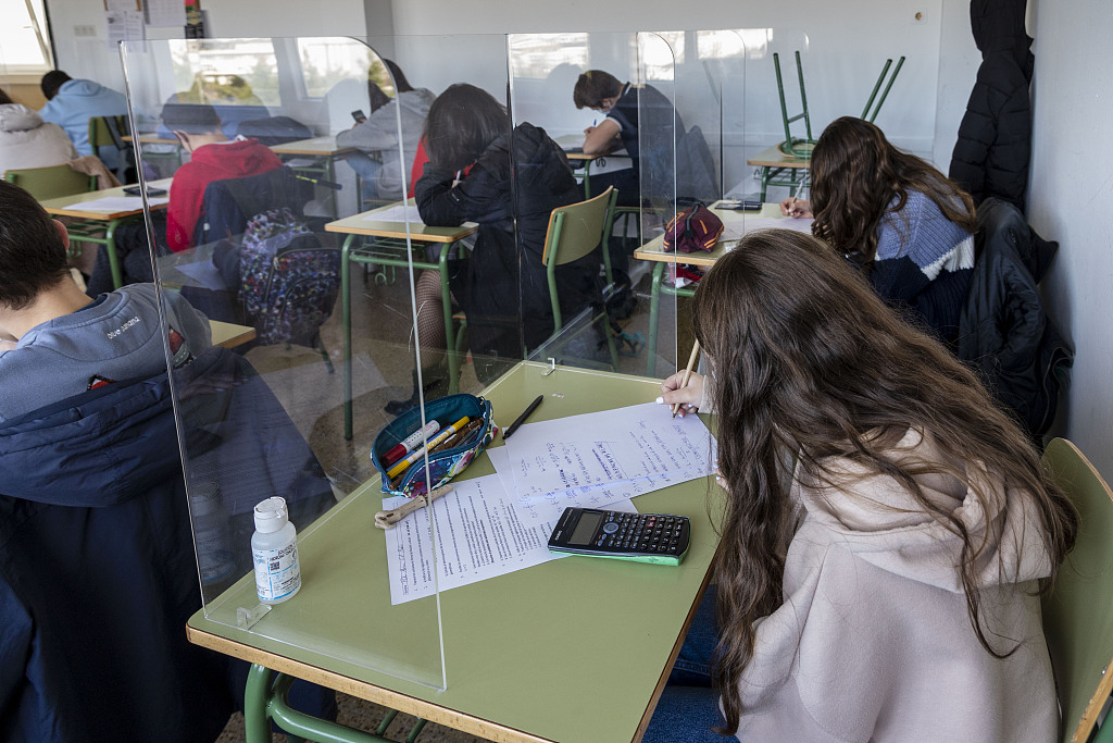 当地时间2021年2月3日,西班牙拉科鲁纳,西班牙新冠疫情进入第三波增长,高中按照政府指示让学生保持安全距离,强制上课时戴口罩并开窗通风。图片来源:人民视觉