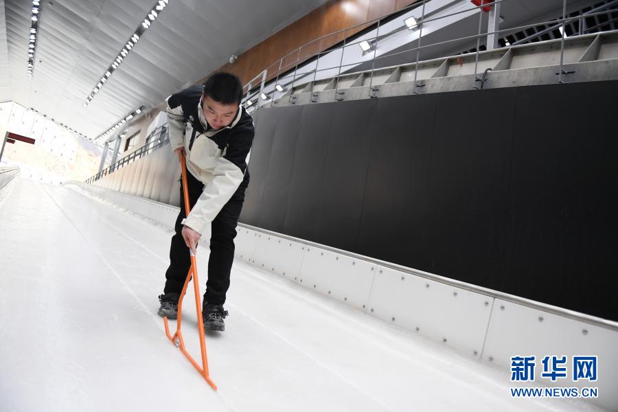 中国制冰师朱永涛在给冰面开槽。新华社记者 张晨霖 摄