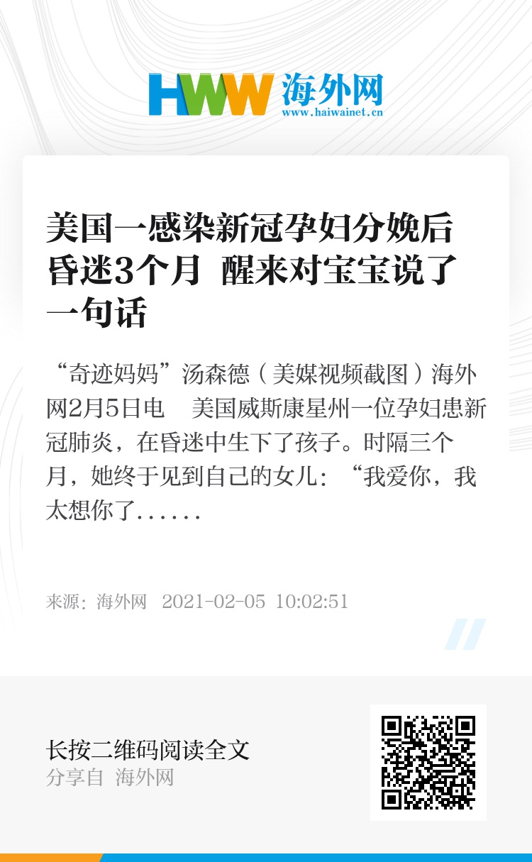 海外网2月5日电 美国威斯康星州一位孕妇患新冠肺炎,在昏迷中生下了孩子。时隔三个月,她终于见到自己的女儿:“我爱你,我太想你了。”