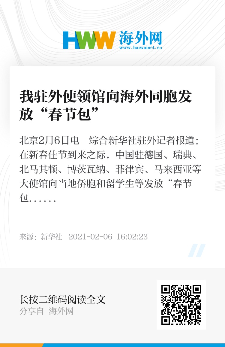 新华社北京2月6日电 综合新华社驻外记者报道:在新春佳节到来之际,中国驻德国、瑞典、北马其顿、博茨瓦纳、菲律宾、马来西亚等大使馆向当地侨胞和留学生等发放“春节包”,送上新春祝福。