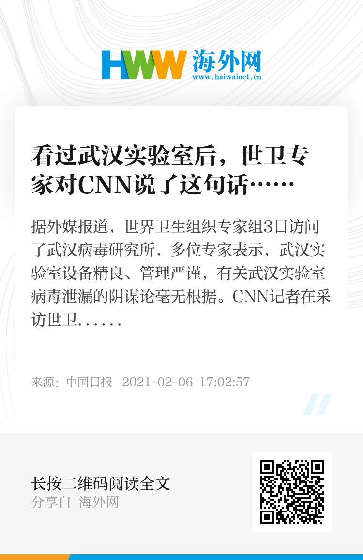 据外媒报道,世界卫生组织专家组3日访问了武汉病毒研究所,多位专家表示,武汉实验室设备精良、管理严谨,有关武汉实验室病毒泄漏的阴谋论毫无根据。