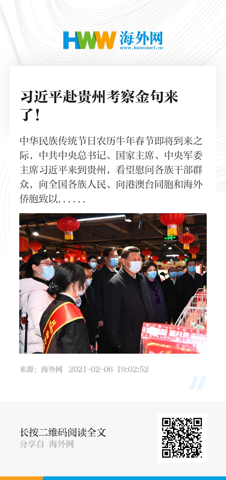 中华民族传统节日农历牛年春节即将到来之际,中共中央总书记、国家主席、中央军委主席习近平来到贵州,看望慰问各族干部群众,向全国各族人民、向港澳台同胞和海外侨胞致以美好的新春祝福,祝福大家身体健康、家庭幸福、事业顺利、牛年吉祥!祝愿伟大祖国山川锦绣、欣欣向荣、繁荣富强!