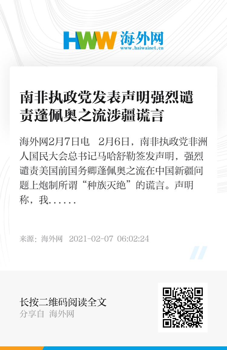 海外网2月7日电 2月6日,南非执政党非洲人国民大会总书记马哈舒勒签发声明,强烈谴责美国前国务卿蓬佩奥之流在中国新疆问题上炮制所谓“种族灭绝”的谎言。