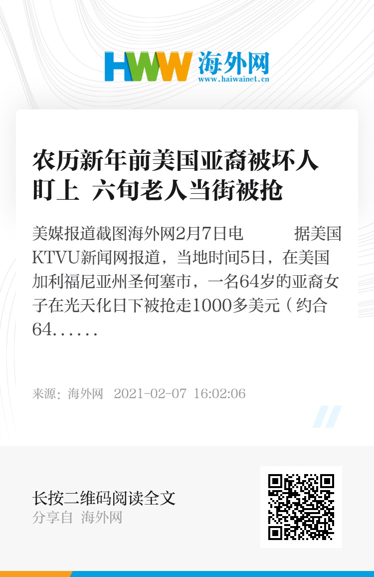 海外网2月7日电 据美国KTVU新闻网报道,当地时间5日,在美国加利福尼亚州圣何塞市,一名64岁的亚裔女子在光天化日下被抢走1000多美元(约合6400元人民币)。当地警方提醒,农历新年前夕,人们要格外警惕抢劫事件发生。