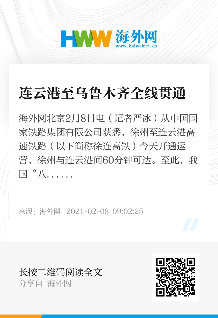 海外网北京2月8日电(记者严冰)从中国国家铁路集团有限公司获悉,徐州至连云港高速铁路(以下简称徐连高铁)今天开通运营,徐州与连云港间60分钟可达。至此,我国“八纵八横”高速铁路网最长横向通道——连云港至乌鲁木齐的高速铁路全线贯通,将为新亚欧大陆桥经济走廊发展提供有力支撑。