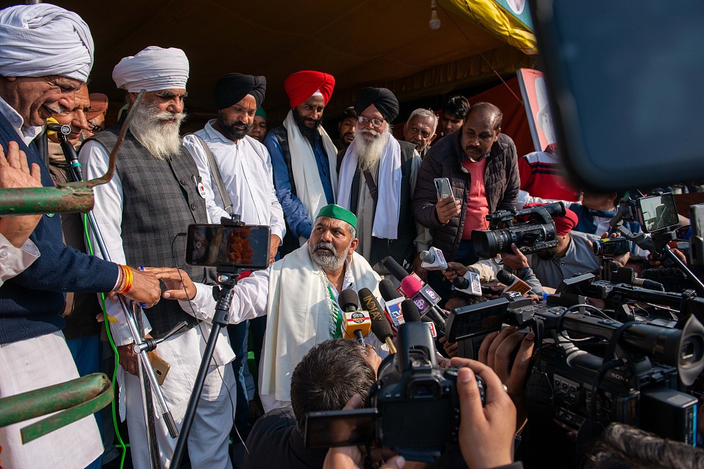 当地时间2021年2月6日,印度,印度农民抗议运动主要组织者之一迪卡特当天在北方邦加齐普尔市出席集会活动时喊话印度政府,要求在今年10月2日之前废除农业改革法,并制定新法以确定农产品收购的最低支持价格。6日中午12时至下午3时,印度各农民联盟在全国各地组织了历时3个小时的堵路运动,印度警方在首都新德里和各邦重要地点部署了上万警力,以避免发生暴力冲突事件。迪卡特表示,如果政府不废除改革法案,农民示威活动将一直持续到10月2日。来源:视觉中国