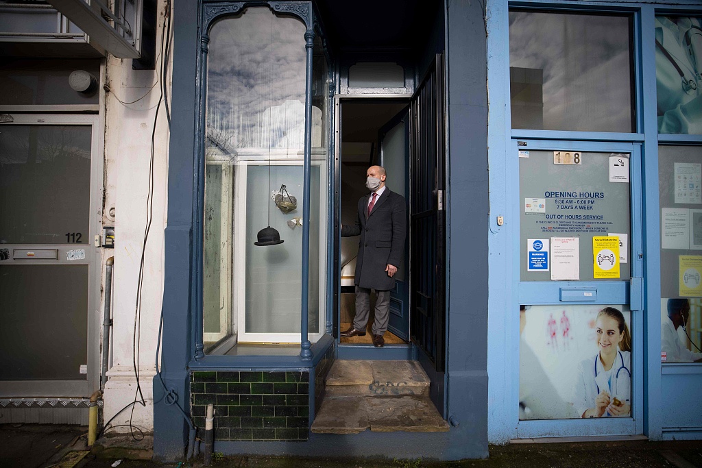 当地时间2021年2月5日,英国伦敦,房地产中介David Myers展示位于Shepherds Bush的一处房产。这处房产被称为伦敦“最窄”的房子,最窄处仅5英尺6英寸(1.6米)左右,建于19世纪末或20世纪初,最初被用作维多利亚时期的帽子店,现售价约为95万英镑(840万人民币)。图片来源:视觉中国