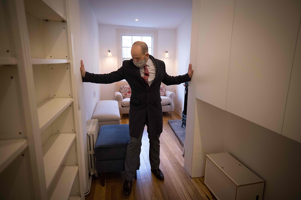 当地时间2021年2月5日,英国伦敦,房地产中介David Myers展示位于Shepherds Bush的一处房产。这处房产被称为伦敦“最窄”的房子,最窄处仅5英尺6英寸(1.6米)左右,建于19世纪末或20世纪初,最初被用作维多利亚时期的帽子店,现售价约为95万英镑(840万人民币)。图片来源:视觉中国
