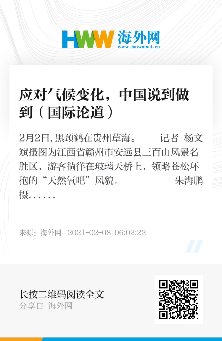 减少温室气体排放是应对全球气候变化的重要环节。近年来,中国接连宣布的国家自主贡献新举措,彰显了中国积极应对气候变化、走绿色低碳发展道路的雄心和决心,极大提振了全球气候治理的信心。对此,国际社会赞赏有加。