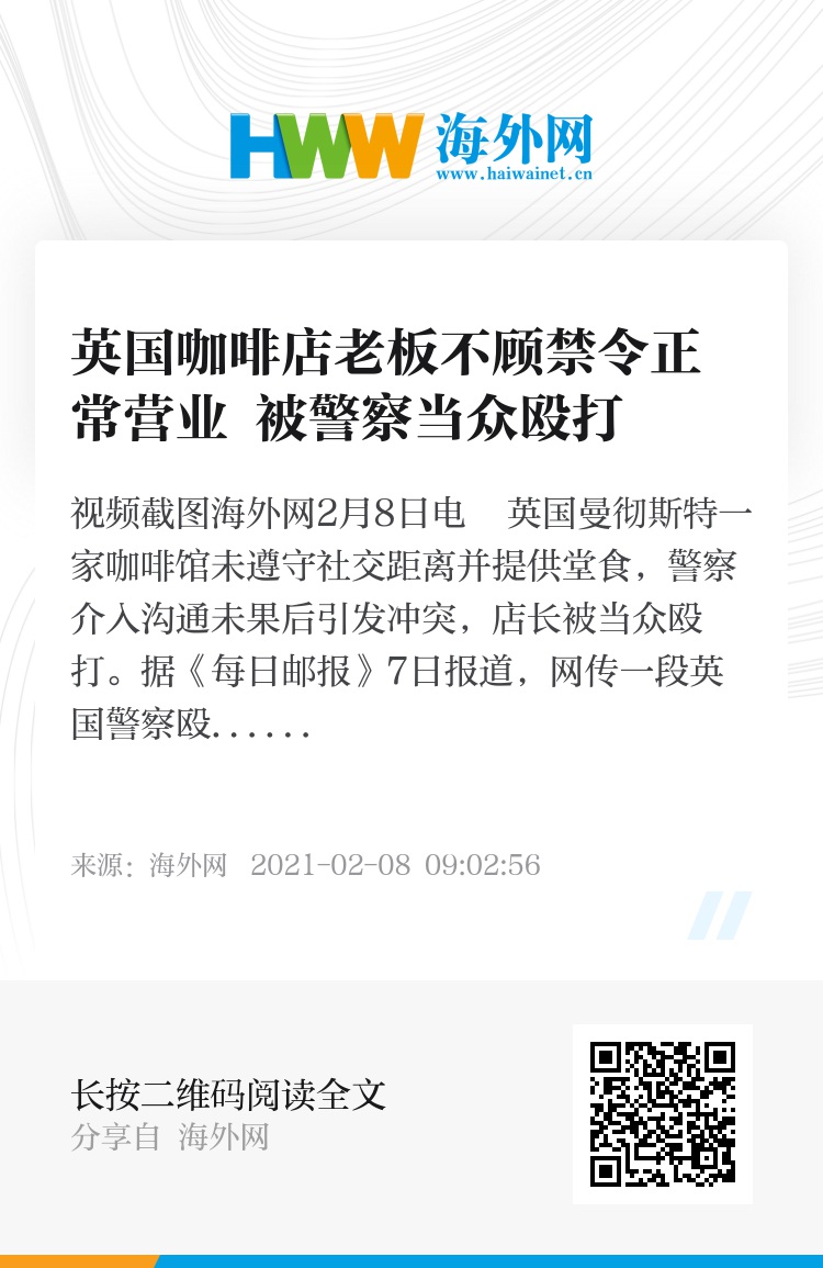 海外网2月8日电 英国曼彻斯特一家咖啡馆未遵守社交距离并提供堂食,警察介入沟通未果后引发冲突,店长被当众殴打。