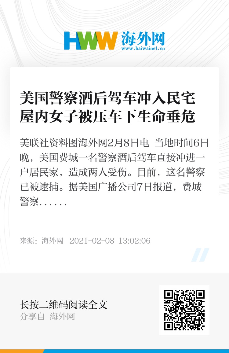 海外网2月8日电 当地时间6日晚,美国费城一名警察酒后驾车直接冲进一户居民家,造成两人受伤。目前,这名警察已被逮捕。