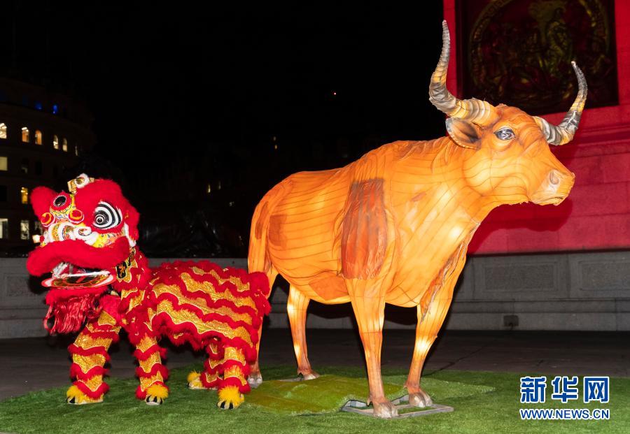 这是2月10日在英国伦敦特拉法加广场拍摄的牛年彩灯和中国舞狮。当日,英国伦敦特拉法加广场点亮“中国红”,庆祝中国农历新年“牛年”的到来。新华社记者 韩岩 摄