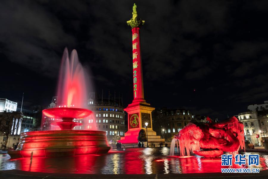 这是2月10日在英国伦敦特拉法加广场拍摄的点亮“中国红”的纳尔逊纪念柱和喷泉。当日,英国伦敦特拉法加广场点亮“中国红”,庆祝中国农历新年“牛年”的到来。新华社记者 韩岩 摄