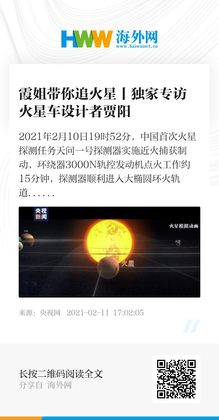今天我们就去专访航天科技集团五院“天问一号”探测器系统副总设计师 火星车设计者贾阳,听听他与火星车的故事。(总台央视记者 崔霞 李宁 吴天白 王艳歌 陶嘉树)