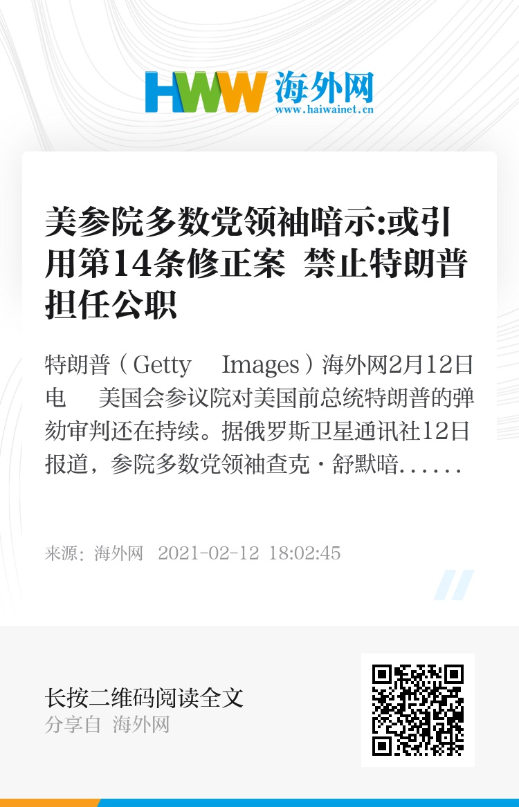 美国《国会山报》曾于1月22日报道称,民主党人正在考虑是否可以引用美国宪法的第14条修正案来禁止前总统特朗普再次担任公职。民主党参议员蒂姆·凯恩此前表示,他对于引用第14条修正案“非常有信心”。