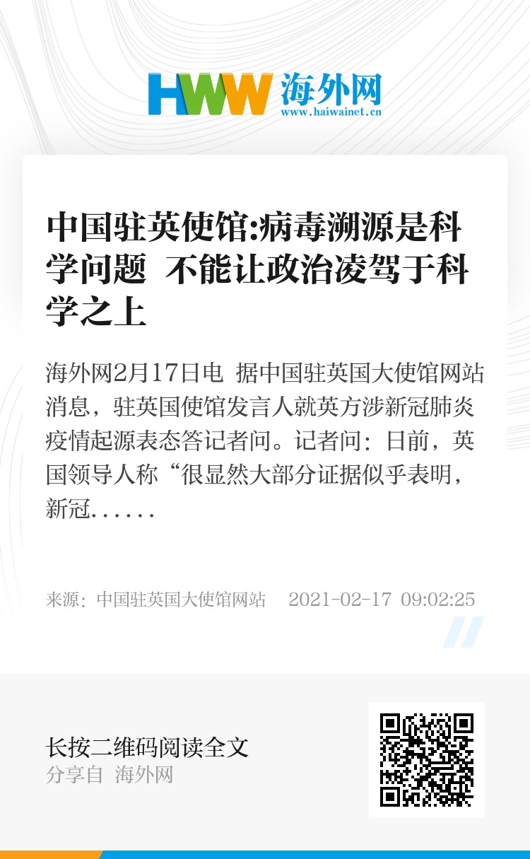 使馆发言人:新冠肺炎疫情暴发以来,中方始终坚持开放、透明的态度,同世卫组织就全球病毒溯源保持密切沟通合作。不久前,国际专家赴华是世卫组织召集的新冠病毒全球溯源科研合作的一部分,中国政府为此提供了大力支持与协助,世卫组织以及包括英国专家在内的国际专家对此给予积极评价。病毒溯源是一个复杂的科学问题,涉及多国多地,应由全球科学家合作开展有关工作。这需要科学的实证精神,不能让政治凌驾于科学之上,不能用无端猜疑和蓄意歪曲代替科学研究。同时,不少线索、报道和研究表明,疫情早在2019年下半年就已在世界多地多点出现,反映出对其他国家和地区进行类似考察的必要性和紧迫性。随着事实证据的不断积累和科学假设的不断发展,溯源工作也将在地域上发生变化。当前,全球疫情仍在肆虐,团结抗疫仍是国际社会首要任务。中方坚决反对有关国家将疫情政治化、对中国污名化,坚决反对向中方甩锅推责。我们衷心希望各国切实展现公正客观和负责任的态度,以实际行动支持世卫组织工作,为国际抗疫合作和构建人类卫生健康共同体作出应有贡献。
