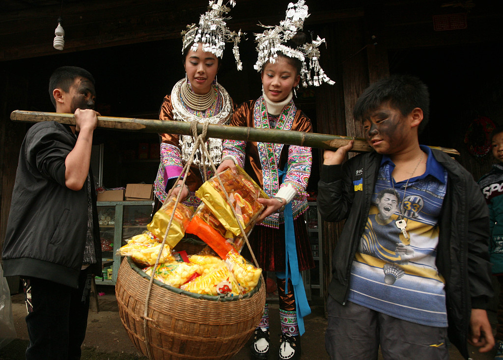 2015年2月19日,在广西融水苗族自治县安太乡江竹苗寨,两名苗妹给讨年货苗家小子送年货。当日是农历大年初一,地处广西大苗山深处的融水苗族自治县的苗家侗寨纷纷举行“猪灵”迎新、“帽告”拜年、吹笙踩堂等传统民俗活动,喜庆农历新年。