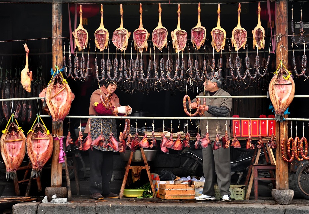 2011年12月29日,浙江省绍兴安昌县农民将制做好的腌制年货,一串串地挂在门前,散发着浓浓的香味。 图片作者:胡学军/视觉中国