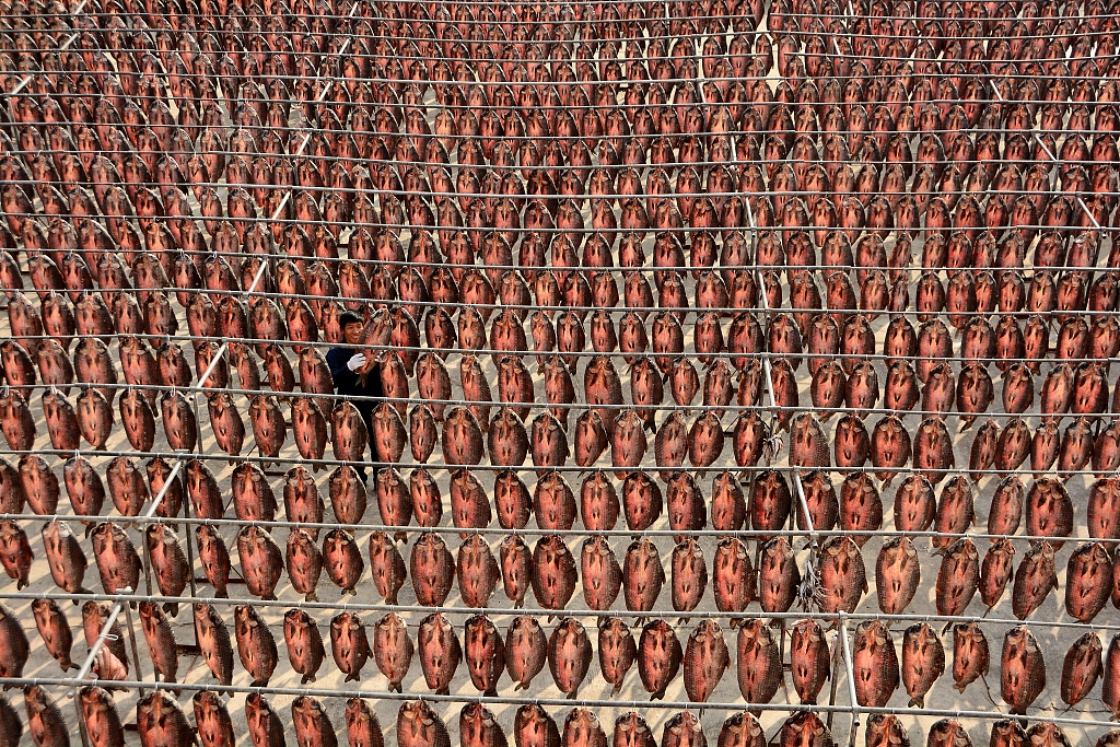 2017年12月12日,浙江省杭州市,余杭区仁和三白潭水产加工厂,院子里晒满了今年的青鱼干,密密麻麻有上千条。 图片作者:汪建春/视觉中国