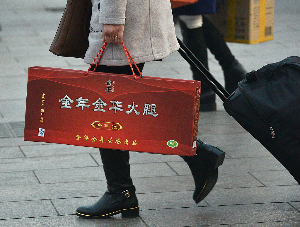 2015年2月14日,春运迎来高潮,北京火车站,回家的人们急匆匆赶往检票口。手里带的年货应有尽有。 图片作者:摄友/视觉中国