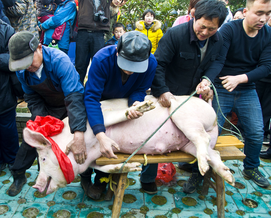 2015年1月24日,南京,2015年“淳年味 原乡愁 在高淳”年货大集开幕。乡亲们在杀年猪。图片作者:谷昌旺/视觉中国