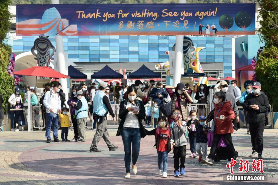 2月18日,香港疫情放缓,海洋公园当日重开,不少市民入园游玩,园内职员提醒游玩市民需注意社交距离,安全游玩。图为市民于海洋公园游玩。 中新社记者 李志华 摄