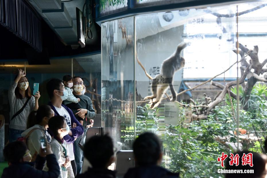 2月18日,香港疫情放缓,海洋公园当日重开,不少市民入园游玩,园内职员提醒游玩市民需注意社交距离,安全游玩。图为市民于海洋公园观看川金丝猴。 中新社记者 李志华 摄
