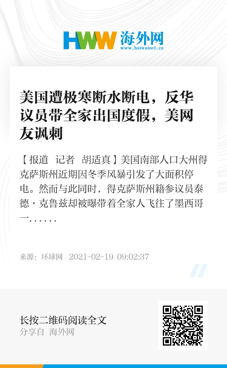 原标题:《得州遭遇极寒断水断电,反华议员克鲁兹带家人去墨西哥度假,网友怒了!》