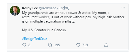 “我的祖父母没有水和电。我在餐厅工作的母亲上不了班,没有工资。我的兄弟作为高风险人群正在排队等待疫苗接种。我的联邦参议员泰德·克鲁兹人在坎昆。”