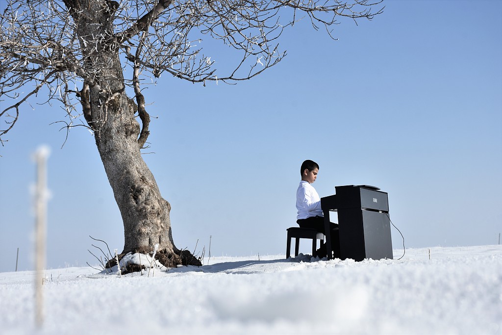 当地时间2021年2月17日,土耳其穆什,9岁视觉障碍钢琴家Bager Calisci在雪地演奏。他梦想着能在树下弹钢琴。图片来源:视觉中国