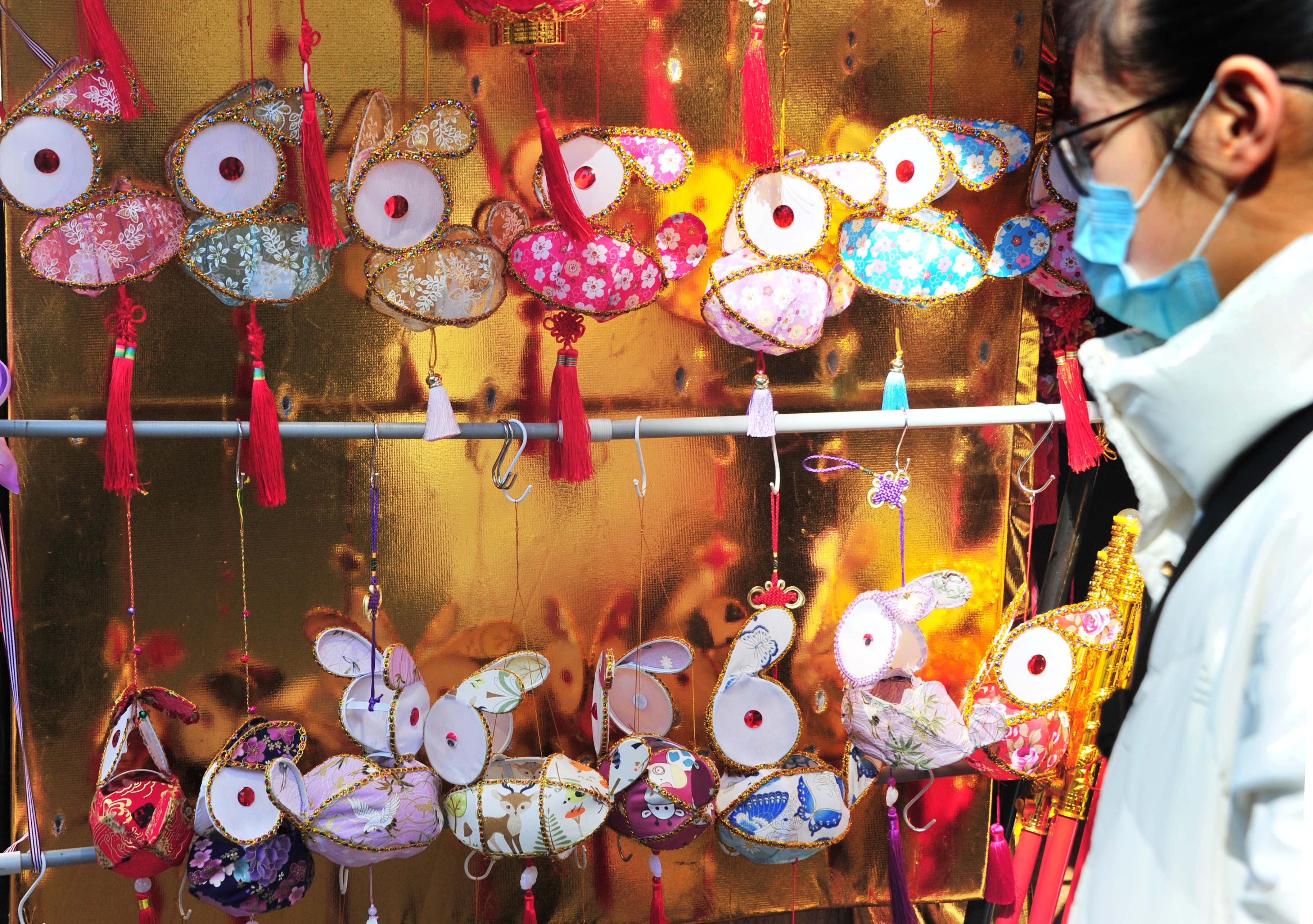 2月18日,牛年春节刚过,元宵佳节又将到来,这几天,上海豫园福佑路小商品市场显得更加热闹,各种各样的元宵花灯已纷纷亮相,除了传统的小灯笼,更多的是玲琅满目的兔子灯,不仅有塑料的卡通工艺灯,也有手工制作的传统兔子灯,小的在68元左右,大的手工兔子灯价格要160元,但一些家长还是给孩子买手工兔子灯较多,因为他们感觉这更有自己小时候的美好回忆。图片来源: 杨建正/IC photo