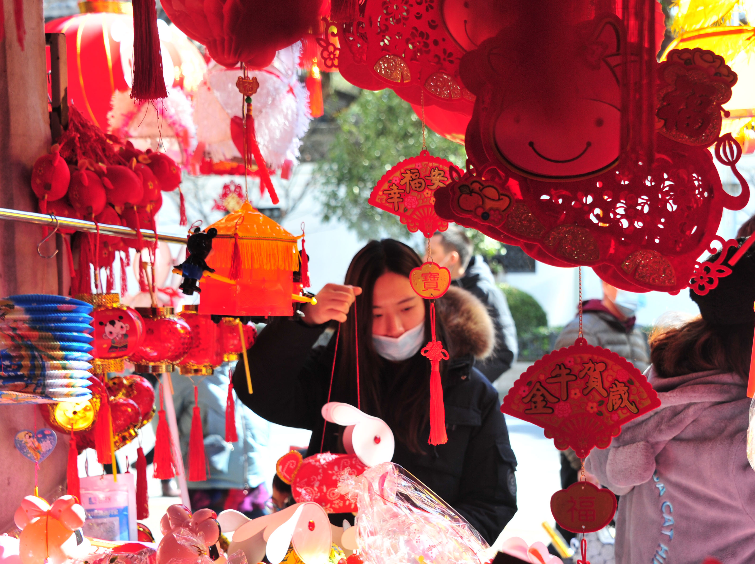 2月18日,牛年春节刚过,元宵佳节又将到来,这几天,上海豫园福佑路小商品市场显得更加热闹,各种各样的元宵花灯已纷纷亮相,除了传统的小灯笼,更多的是玲琅满目的兔子灯,不仅有塑料的卡通工艺灯,也有手工制作的传统兔子灯,小的在68元左右,大的手工兔子灯价格要160元,但一些家长还是给孩子买手工兔子灯较多,因为他们感觉这更有自己小时候的美好回忆。图片来源: 杨建正/IC photo