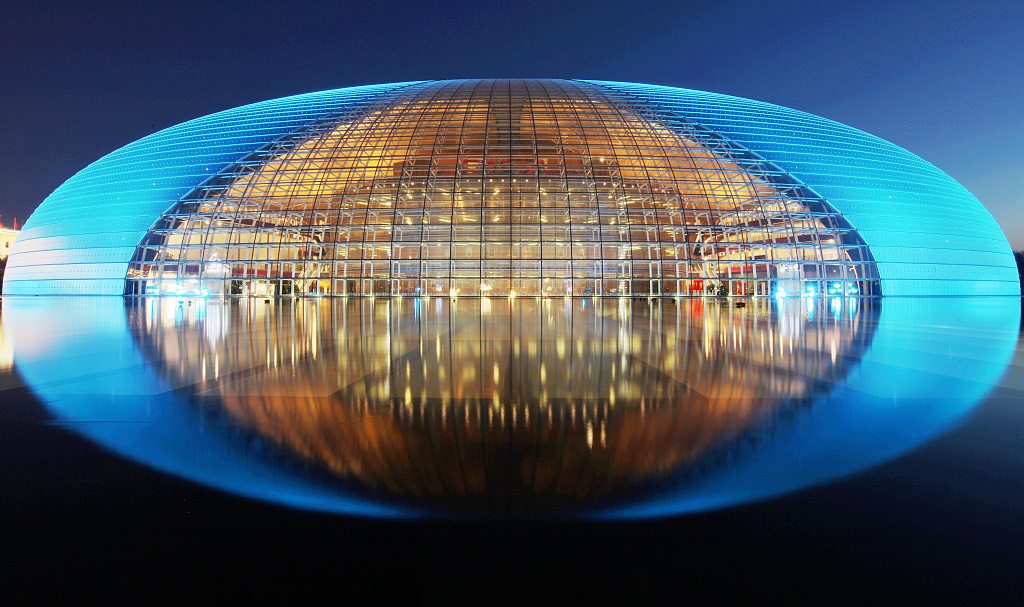 新春佳节,2月17日,北京国家大剧院点亮节日景观,夜幕下流光溢彩,五彩缤纷庆新春。图片来源:视觉中国