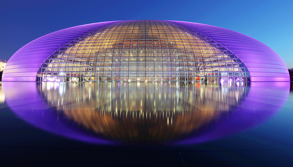 新春佳节,2月17日,北京国家大剧院点亮节日景观,夜幕下流光溢彩,五彩缤纷庆新春。图片来源:视觉中国