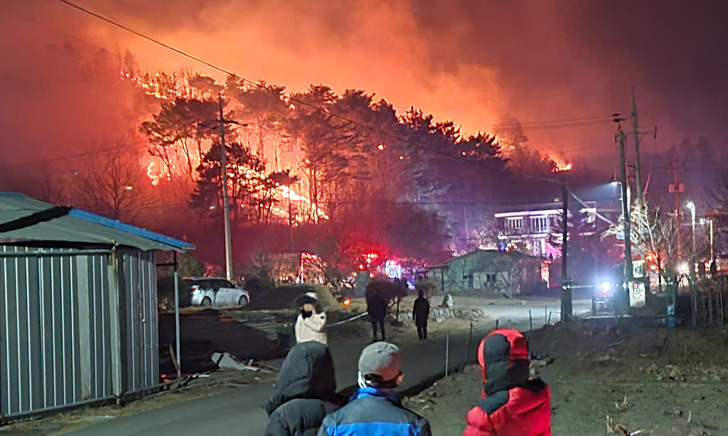 当地时间2月18日,韩国江原道襄阳郡当地一仓库发生火灾,蔓延至附近丘陵,引发森林大火,火光将天空染红。图片来源: 东方IC