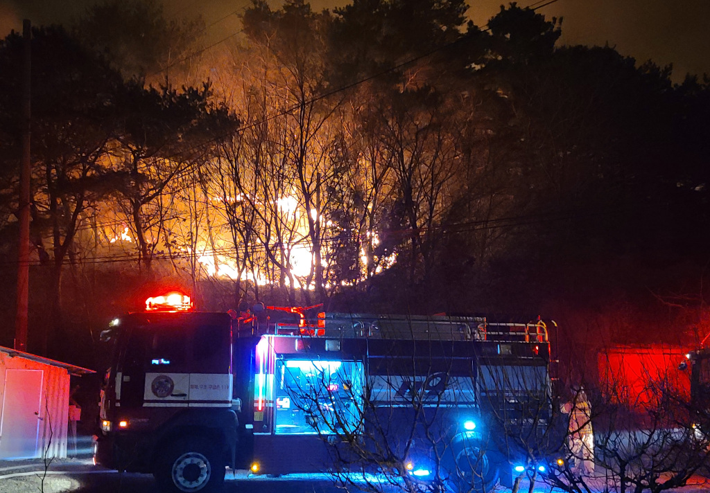 当地时间2月18日,韩国江原道襄阳郡当地一仓库发生火灾,蔓延至附近丘陵,引发森林大火,火光将天空染红。图片来源: 东方IC