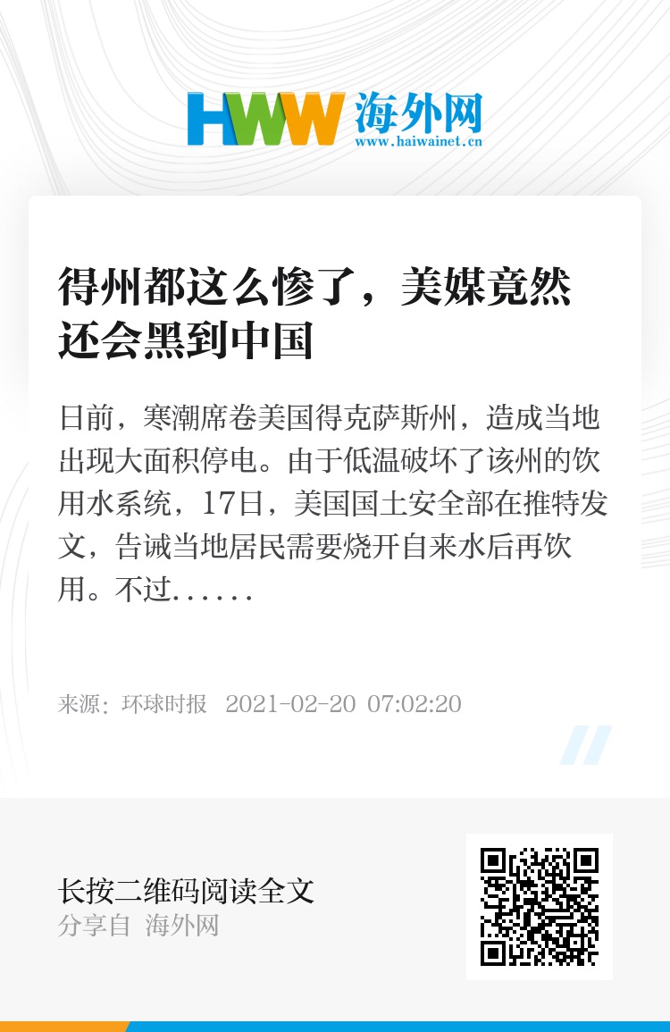 日前,寒潮席卷美国得克萨斯州,造成当地出现大面积停电。由于低温破坏了该州的饮用水系统,17日,美国国土安全部在推特发文,告诫当地居民需要烧开自来水后再饮用。