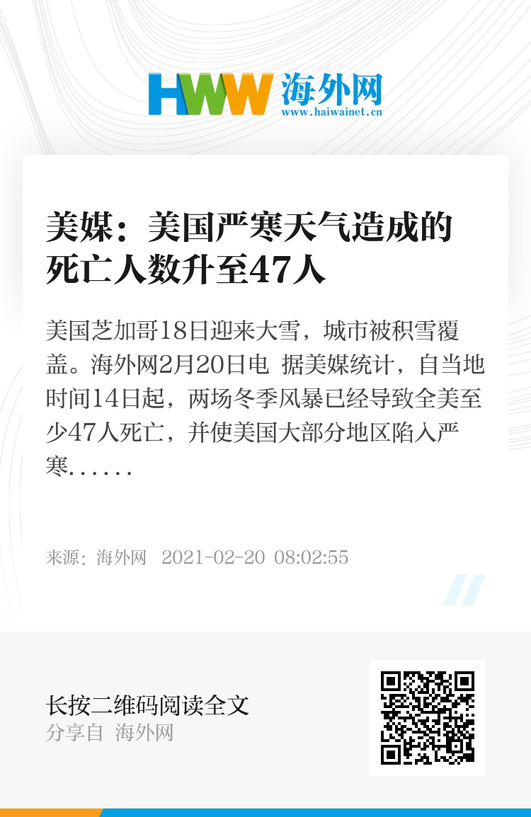 海外网2月20日电 据美媒统计,自当地时间14日起,两场冬季风暴已经导致全美至少47人死亡,并使美国大部分地区陷入严寒之中。由于寒冷天气仍在持续,预计未来几天死亡人数还将上升。